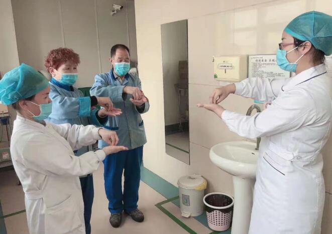 在医办室,医护人员一起练习七步洗手法,将手卫生实实在在落实于诊疗护理活动中,鼓励大家相互提醒、相互监督。