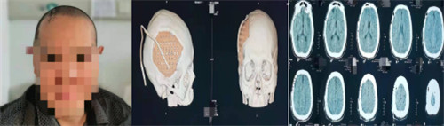 患者男性,27岁,因外伤行开颅手术致右侧额颞顶部颅骨缺损已2年,入住市中心医院。经详细向家属交代目前修补材料及固定材料后,因患者年轻,家属要求无金属材料修补颅骨缺损。在白西民主任统筹安排下,经姚胜主任医师及朱奕儒主治医师仔细评估及材料准备,术前运用3D切割技术制作颅骨修复假体,术中仔细分离出颅骨缺损骨质边缘,将PEEK修复材料嵌入并运用4枚PEEK颅骨锁固定,最终成功完成手术。术后患者颅貌恢复良好,固定牢固,头皮与修复材料贴敷良好,无皮下积液。患者顺利出院,对手术效果十分满意。