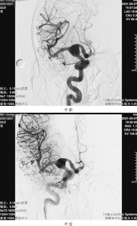 术中经T-track微导管送入Tubridge5.0mm×45mm密网支架一枚,完全覆盖动脉瘤,即刻造影显示动脉瘤瘤腔内造影剂滞留明显,载瘤动脉通畅,顺利完成手术。