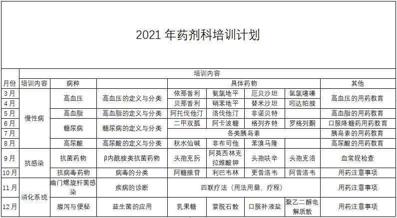 2021年3月起,药剂科积极组织科室人员强化学习、夯实基础,着力打造学习型科室,每月针对重点疾病,特殊人群等给出学习范围、学习大纲以及具体学习内容。