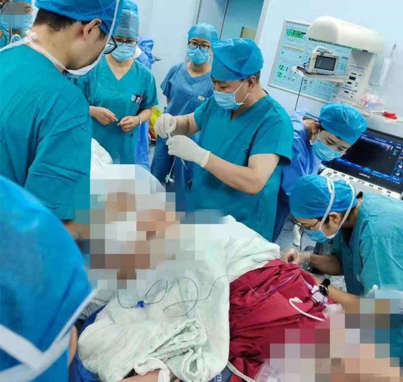 近年来,介入科参与的院内MDT抢救病例,如大咯血、外科术后出血、孕产妇羊水栓塞等等不在少数。近日产科一24岁产妇,剖宫产术即将结束时,患者出现羊水栓塞,血压血氧下降,深静脉置管困难,抢救药品无法快速给入患者体内,介入科李建国主任接到产科急会诊电话,飞奔到达手术室行右股静脉穿刺,随着抢救药品和液体的给入,经过各科室配合抢救,患者转危为安。