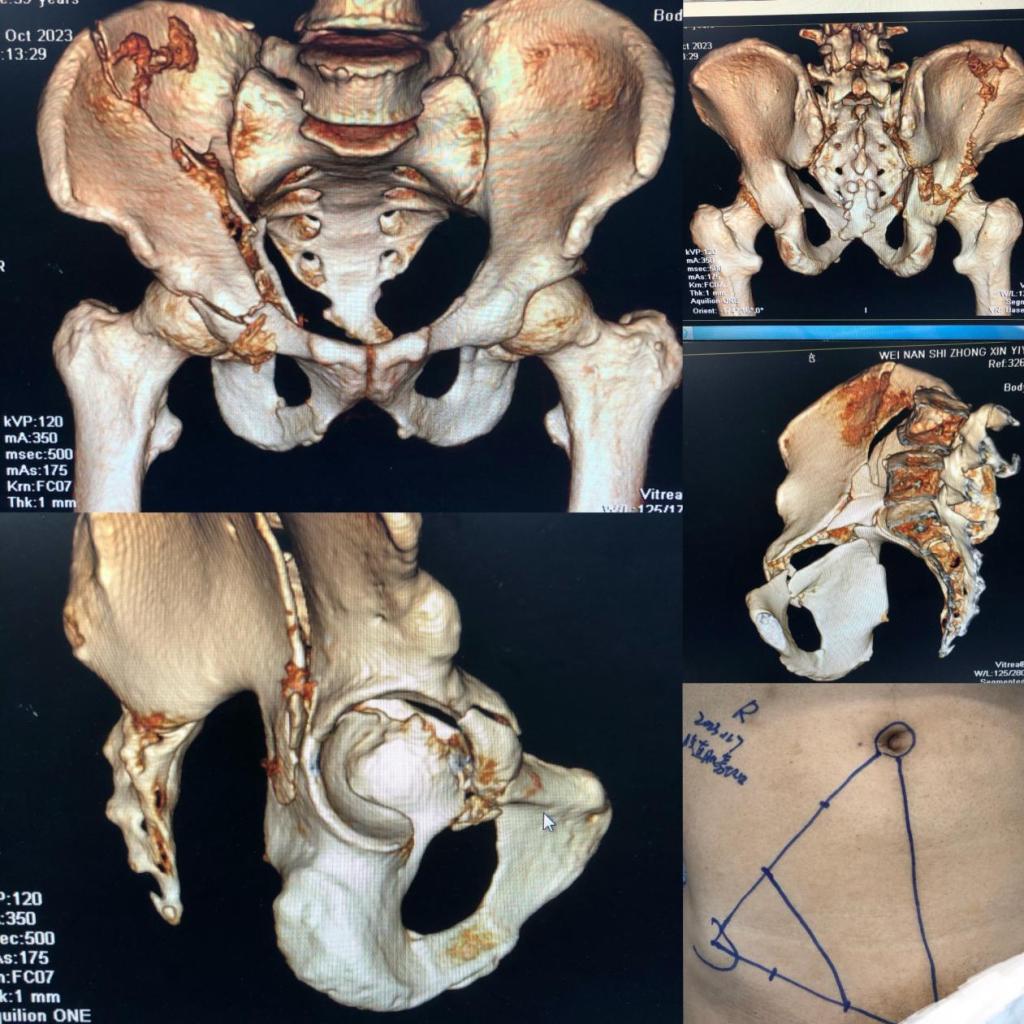 患者车祸致伤入院后,李玉民主任医师组织科内多次讨论认为,该患者为高能量损伤致复杂髋臼骨折,Letournel-Judet分型为高位前柱伴后半横骨折,股骨头中心脱位致臼顶、四方体粉碎性骨折,后柱横断向后方移位,前柱高位骨折伴旋转移位,头臼不匹配,臼内台阶明显,髋关节失去正常形态,失去明显的解剖标志,严重功能受限。须尽早积极手术治疗,否则后期出现畸形愈合关节功能丧失,股骨头坏死,致残率增高失去劳动能力。