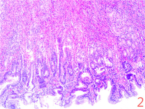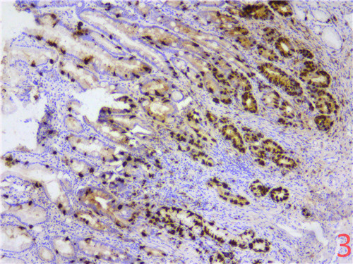 显微镜下所见:胃窦粘膜表层可见肠上皮化生,固有腺体减少,代之以假幽门腺化生,固有层内有较多淋巴细胞、嗜酸性粒细胞浸润,可深达粘膜肌内,局灶见呈巢状或腺样排列,细胞形态较一致,胞核染色质细腻的上皮样细胞(图2);免疫组化显示上述细胞CgA(图3)阳性。