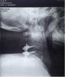 11月13日行手术治疗,后前路联合手术。先行颈后路切开,颈3-6椎体侧块螺钉固定,再行前路颈4.5间盘以及颈前脓液清理,椎间隙植骨融合术。术中见颈4.5椎间隙前缘被一直径1.5㎝肿物包裹,打开后,可见其内少许米汤样脓性液,肿块壁为脓性物。间盘内充填相同物,上、下缘软骨板漂浮,翘起,上下椎体相邻面骨质酥脆,同时后缘有大量不良增生物,骨钩分离后,可见自颈5椎体后缘,流出同样的米汤样脓液。彻底清理脓性液,充分刮除椎体不良骨质。大量生理盐水冲洗,取三面皮质髂骨块置于椎间隙,敲紧。术后前侧放引流管于脓腔间隙。术后留置3.5天。术中留取的脓液细菌培养仍为阴性,刮出的椎间盘及囊壁病检结果显示为化脓性炎表现。术后继续抗生素治疗,患者体温正常,四肢肌力改善明显,下肢肌力术后第2天恢复至2级。上肢肌力4级弱。躯干部位感觉平面下降至乳头以远,大小便功能改善不明显。