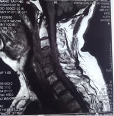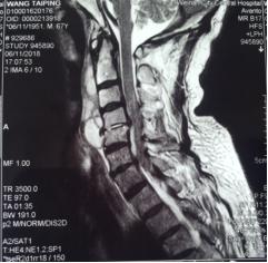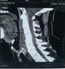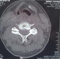 患者,王xx,男,67岁,以颈部疼痛半月,并四肢活动感觉障碍1周入院。半月前,患者因颈部疼痛,同时有发热在外院对症治疗,发热缓解后出院。颈部疼痛缓解不显著。后期患者出现颈痛加重表现,伴有四肢麻木,无力,行走困难。再次在外院颈椎MR检查后发现颈椎椎体破坏,甲状腺B超发现占位病变。给以止痛,神经营养治疗。住院期间患者出现下肢肌力的显著下降,大小便障碍。