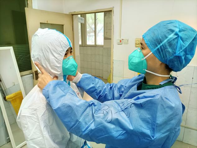 抗击疫情,感控当先。在工作人员进入隔离病区前,外感护士必须首先为大家把好第一道安全防线。“检查一下口罩的密合性”“头发要全部遮挡在帽子里面”“检查一下防护服有无破损,下蹲、看看有无漏气……”这是外感护士每天对大家说的最多的话。有一次,战友们穿好防护服准备进入病区时,我发现其中一人领口处有点松开,立刻喊停,重新进行检查、固定。“这一点缝隙应该没事吧?”“你可千万不能大意,要做到从头到脚密不透风,才能保证你们的安全!”作为一名感控护士,要时刻心系整个团队的安危,工作中容不得半点马虎。
