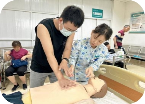 互动环节中,两位老师对患者及家属们提出的问题一一解答,患者及家属们争相交替进行练习,医务人员在旁纠正错误动作,有效提升患者面对突发情况现场急救的能力。