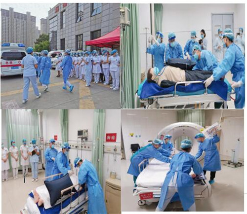 急救演练部分由急诊科范华杰主任主持、穆晓红护士长现场指挥,急诊科全体医护共同参与。模拟演练120急救中心送入1例高度疑似新冠危重发热患者的应急接诊流程。演练过程中,急诊接诊人员立即启动应急预案,在正确防护下进行了流行史询问、危重患者预检分诊、隔离处置、危重患者抢救、转科、疫情上报和规范消毒处置工作,各个环节流程通畅,各项工作有序开展。院级急诊急救小组联络员分别在急诊分诊东口、急诊预检分诊台、急诊隔离抢救室学习观摩,进一步掌握预检分诊、诊疗抢救、护理治疗等重要环节的防控关键要点。