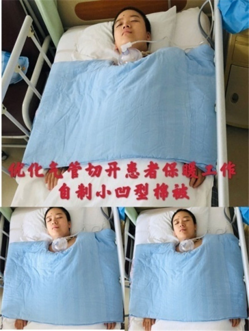 由于神经外科气管切开患者居多,患者肩部长期处于裸露状态,大家制作小凹型棉被,优化了气管切开患者的保暖工作。