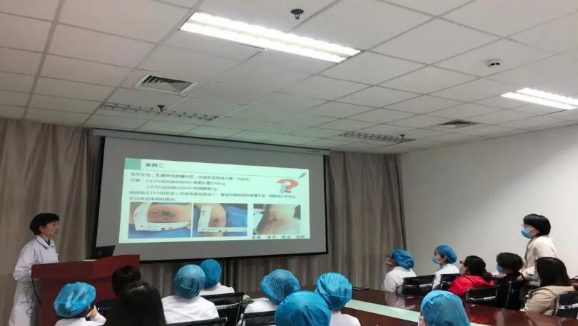 王爱平护士长带来了《以此为戒 警钟长鸣——输液治疗不良事件案例分析》,将临床中静脉输液治疗不良事件的案例与大家分享。案例包含去甲肾上腺素外渗、甘露醇外渗、化疗药物的外渗等。她详细讲解了案例的过程、处理措施、经验和体会等,鼓励静疗小组联络员参与讨论,认真分析不良事件的发生原因,现场发现问题、分析问题、解决问题。通过分享学习,大家总结经验教训,防范于未然,杜绝和避免类似事件再发生。