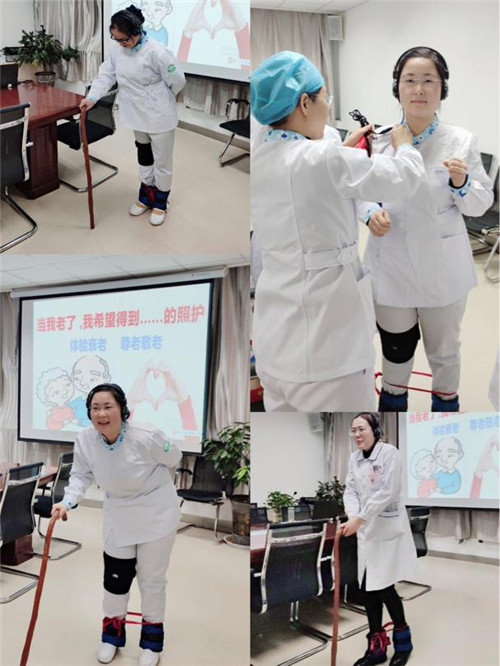 护士们用沉重的沙袋、耳塞和隔音耳机、老花镜、手套、夹板等用物作为道具,让年轻护士感受老人模糊的视力和听力、举步维艰的步伐、笨拙的双手、僵直的关节和腰身。每一位体验者,都深刻体会到老人看不清东西时的焦急,走路不稳时的恐惧,听不清声音时的茫然,更加理解老人们的不便和需求。纷纷表示在今后工作中要更加关爱老人,主动为老人提供适时服务。