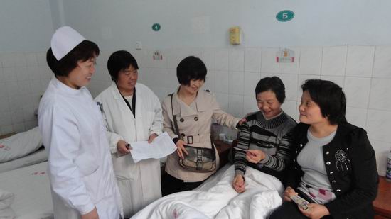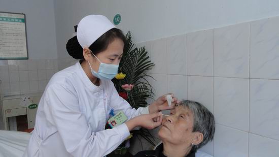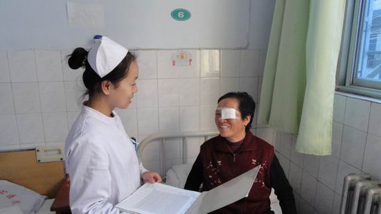 自第一批免费手术患者前来住院开始,我们从第一站的微笑接待、送检到医生的认真检查、筛选,从责任护士耐心宣教到无微不至的生活护理,科室工作在忙而有序的进行中。为了防止术后感染,确保患者手术安全进行,科室建立了滴眼药水专用表格,特派一名护士专人负责,每日认真核对,并按时为患者点眼药水;责任护士加强了围手术期管理,患者用药评估及宣教、老年病人的血压监测及病情观察等;各班护士在病人术前剪睫毛、冲洗泪道等各项工作中认真负责、扎实到位;手术病人安排有序,专人接送,术后宣教认真、全面,保证了每例手术的安全进行和术后视力的恢复。与此同时,在大家为患者多一句问候、打一份开水、买一份爱心早点、洗一次头、剪一次指甲、搀扶检查等小事情上,更能从细节上体现出我科全体人员将优质护理服务工作融入其中。在全科同志的共同努力下,到目前为止已圆满完成了100例白内障复明任务,并获得了病陪人的一致好评。