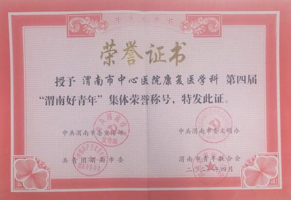 4月28日,在五四青年节来临之际,第四届“渭南好青年”表彰大会举行。乐鱼在线登录入口康复医学科喜获第四届“渭南好青年集体”,受到市委宣传部、文明办、共青团渭南市委、市青年联合会表彰。