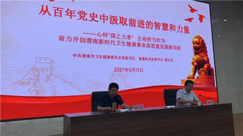 市卫健委党组书记、主任翟玉宝以《从百年党史中汲取前进的智慧和力量——心怀“国之大者”主动担当作为 奋力开创新时代卫生健康事业高质量发展新局面》为题讲了一堂生动的党课,从为什么学、学什么、怎么学三个问题入手,生动讲解了中国共产党波澜壮阔的百年历史,引导我市卫健系统党员学史明理、学史增信、学史崇德、学史力行,奋力开创新时代渭南卫生健康事业高质量发展新局面,以优异成绩庆祝建党100周年。