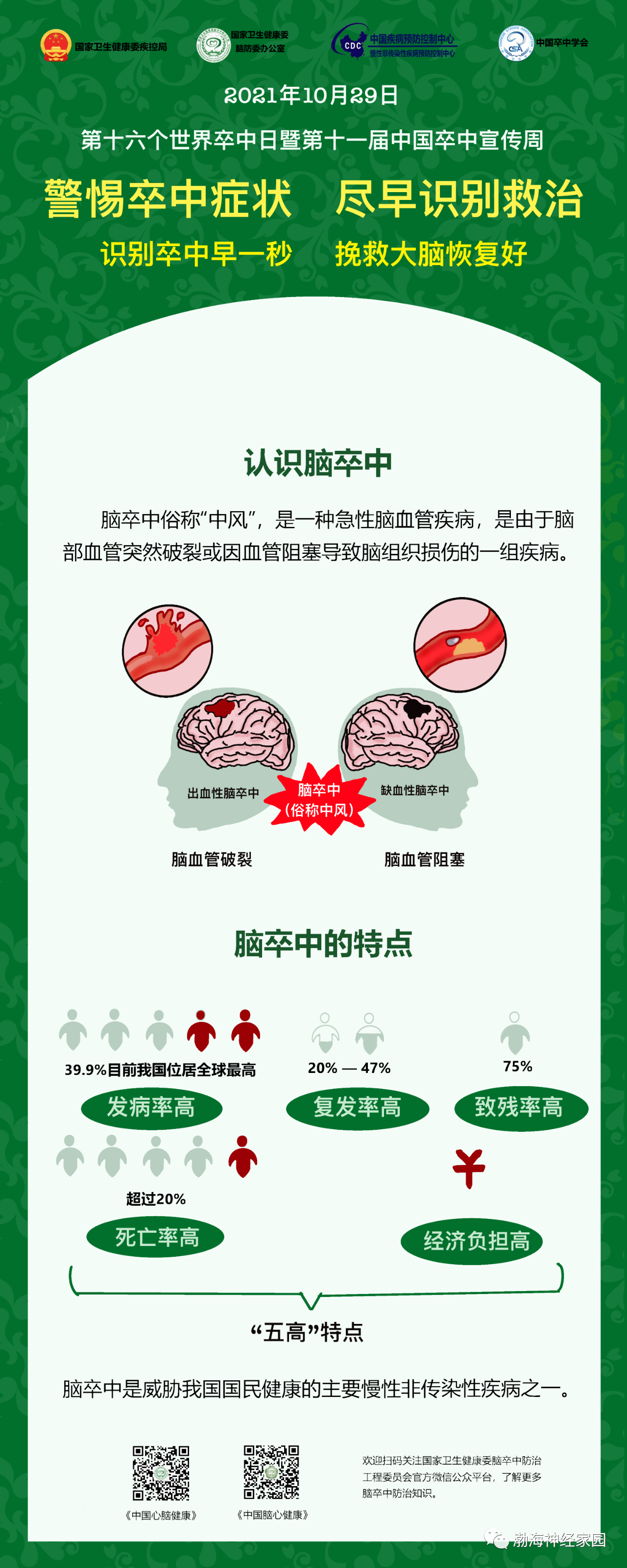 2021年10月29日是第16个“世界卒中日”。为贯彻落实《健康中国行动(2019-2030年)》《国家卫生健康委疾控局关于开展2021年慢性病系列宣传活动的通知》等文件精神,有效预防和控制脑卒中高危因素,提高群众卒中识别能力,减少因脑卒中导致的残疾、死亡发生,按照国家卫生健康委脑卒中防治工程决定组织开展“2021年世界卒中日暨第11届全国卒中宣传周系列活动”。