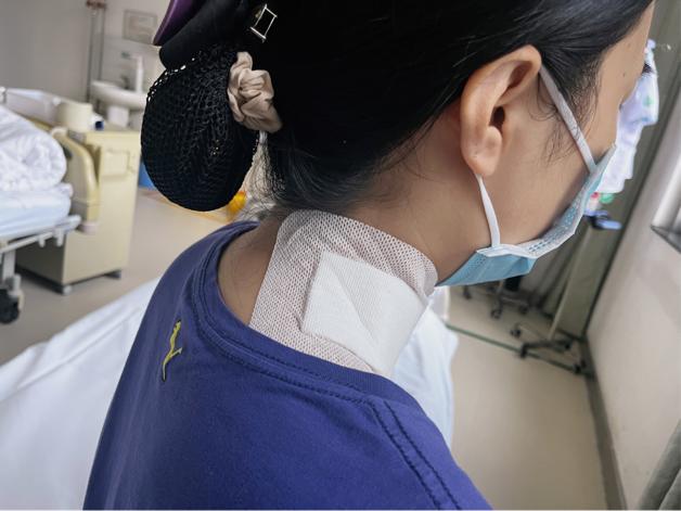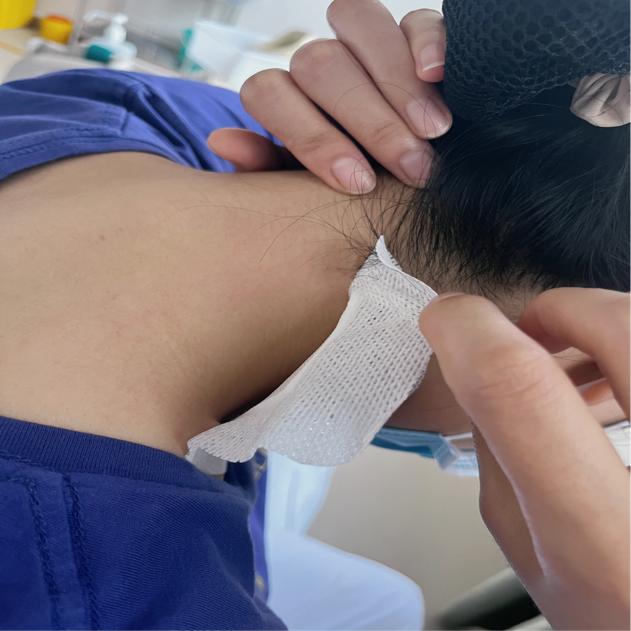 她自告奋勇尝试,敷料贴上去那一刻,就感觉自己脖子被控制住了。特别是有的头发还被粘住,一动就拽的疼。三十分钟后已经开始发痒,忍不住想去挠。五十分钟后,已经无法忍受,只想赶快撕下来,这时候皮肤已经发红。
