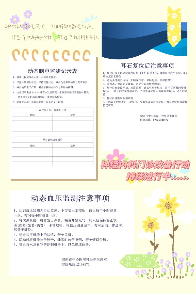 制定“神经内科系列检查注意事项”,包括耳石复位后注意事项、动态血压监测注意事项、动态脑电图监测记录表,让患者了解检查目的、形式,便于高效、高质量完成检查。知晓检查注意事项,让患者明白耳石复位后应该注意些什么、采取什么样的体位可以缓解不适,携带动态血压时仪器的测量频率,佩戴脑电图时应如何配合、记录诱发时间等等。